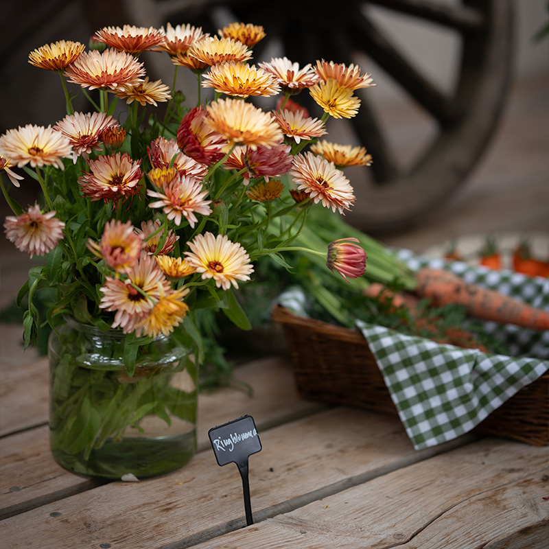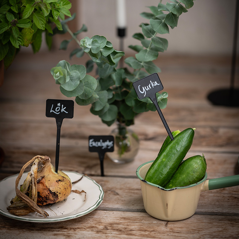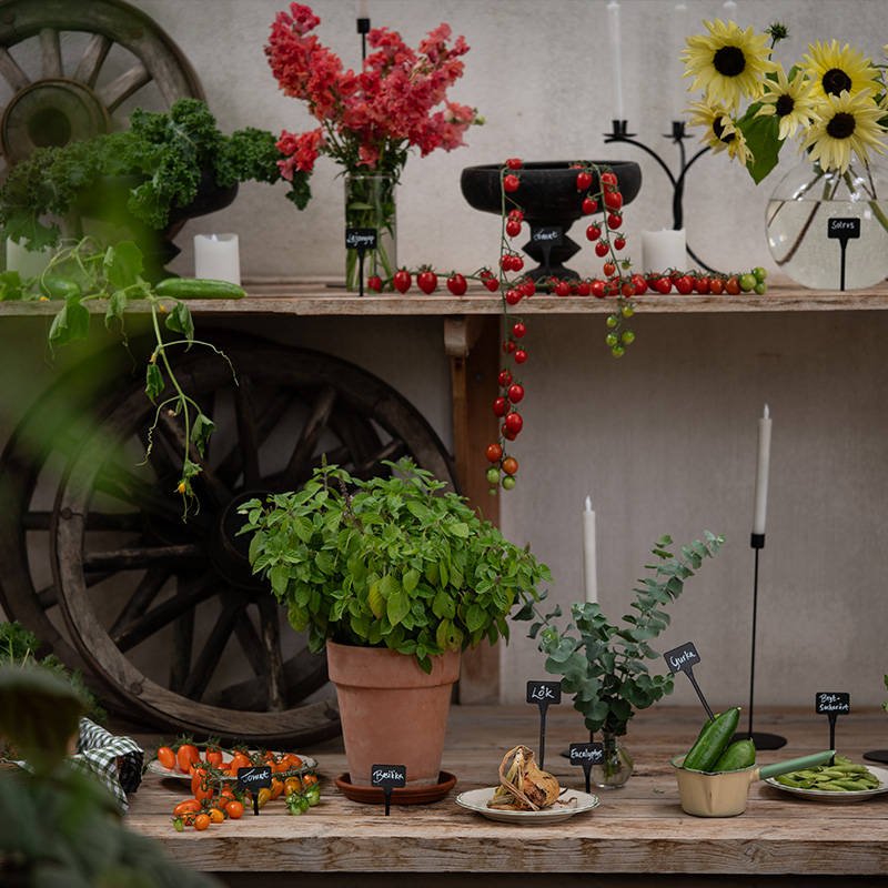 1. Bindsalat 'Little Gem' + Sommergulerod 'Amsterdam 3' + Morgenfrue 'Orange Flash' + Dværg-sukkerært 'Delikett'2. Drivhusagurk F1 'Picolino' + Eukalyptus 'Baby Blue' + Sommergulerod 'Touchon'