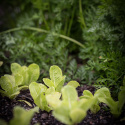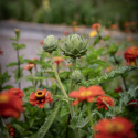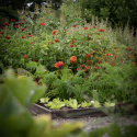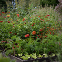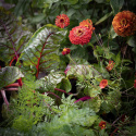 En rødgylden køkkenhave er en blanding, der spreder solskin selv på skyede dage. Statelige artiskokker 'Green Globe' giver højde til beplantningen, der er badet i et blomsterhav af høje, orangeglødende fløjlsblomster 'Burning Embers'. Gulerod 'Oxheart' og bladbede 'Rhubarb Chard' flammer i fyndige, rød-orange toner. Sprød bindsalat 'Blonde maraîchère' giver ro med sine friske, grønne blade, mens frøkenhat 'Oriole' stråler som små sole over det frodige løv.